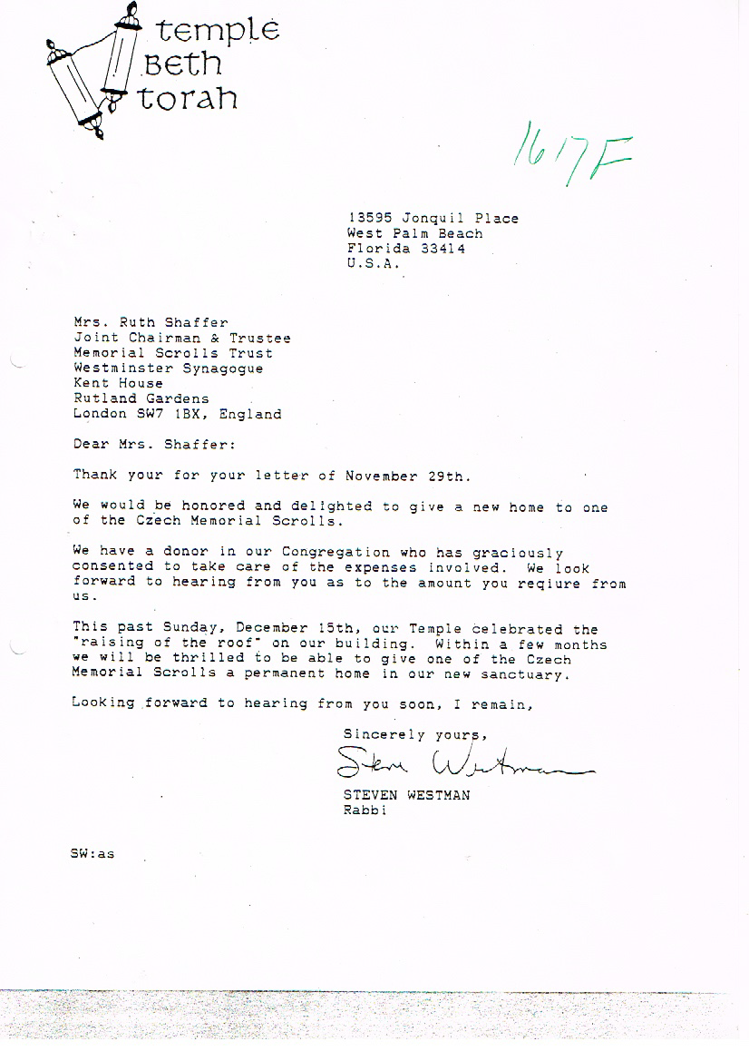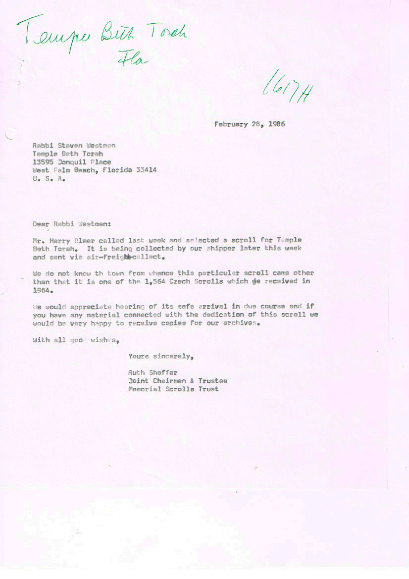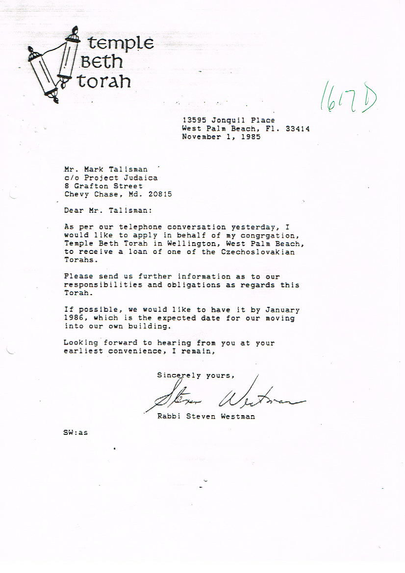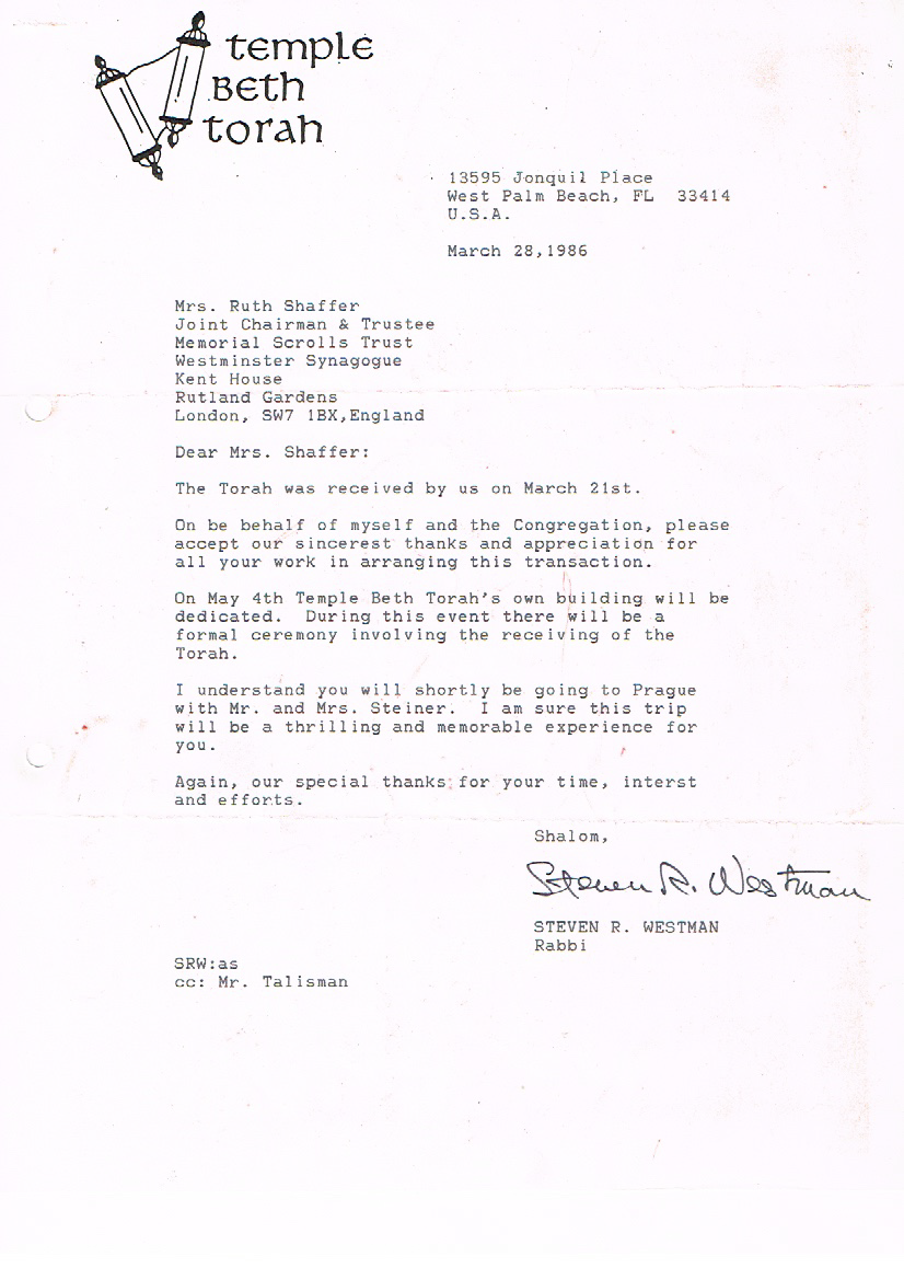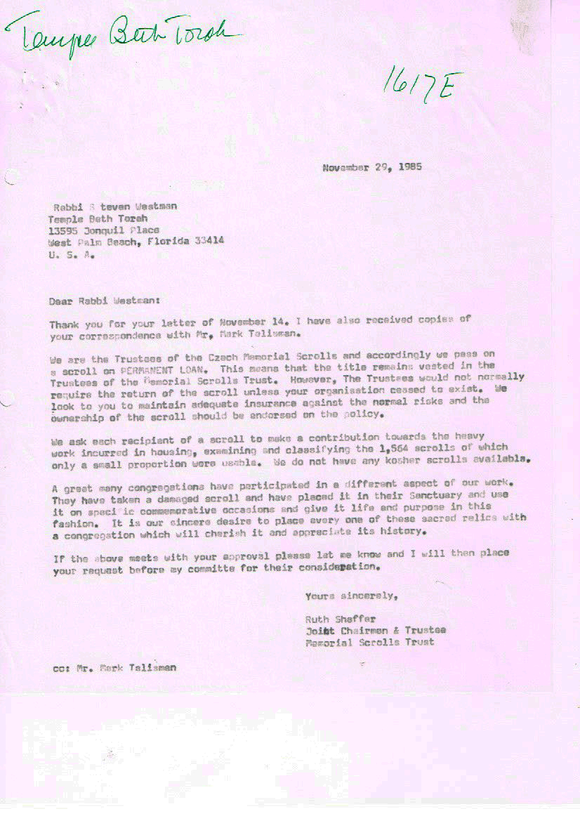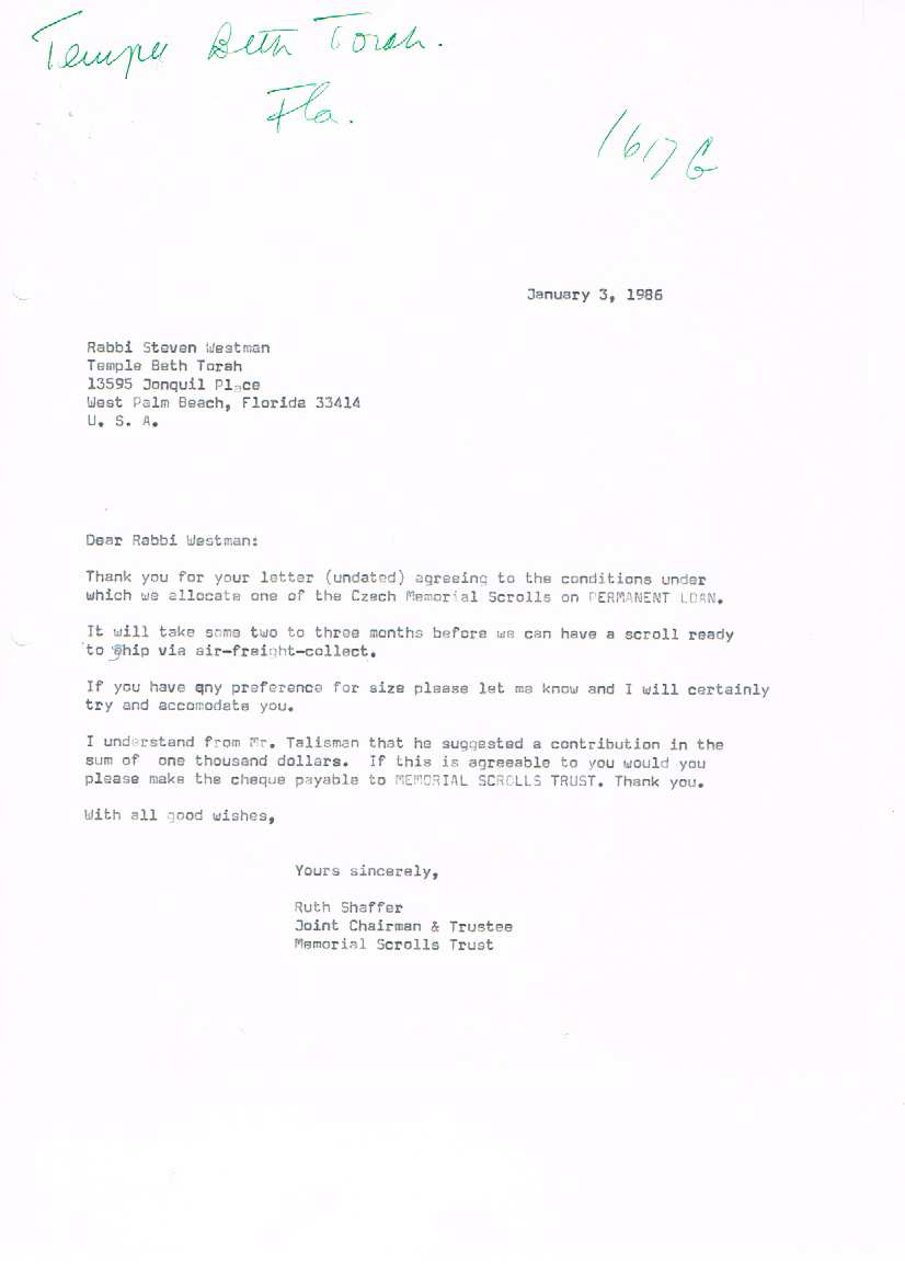 On November 1, 1985, Rabbi Steven Westman began the formal process of requesting one of the Memorial Czech Torah Scrolls that were recovered in 1964 be sent to Temple Beth Torah on permanent loan for our congregation. The following documents are a series of correspondence between Rabbi Westman and the Memorial Scrolls Trust. The scroll arrived on March 21, 1986, just in time for the temple’s building dedication