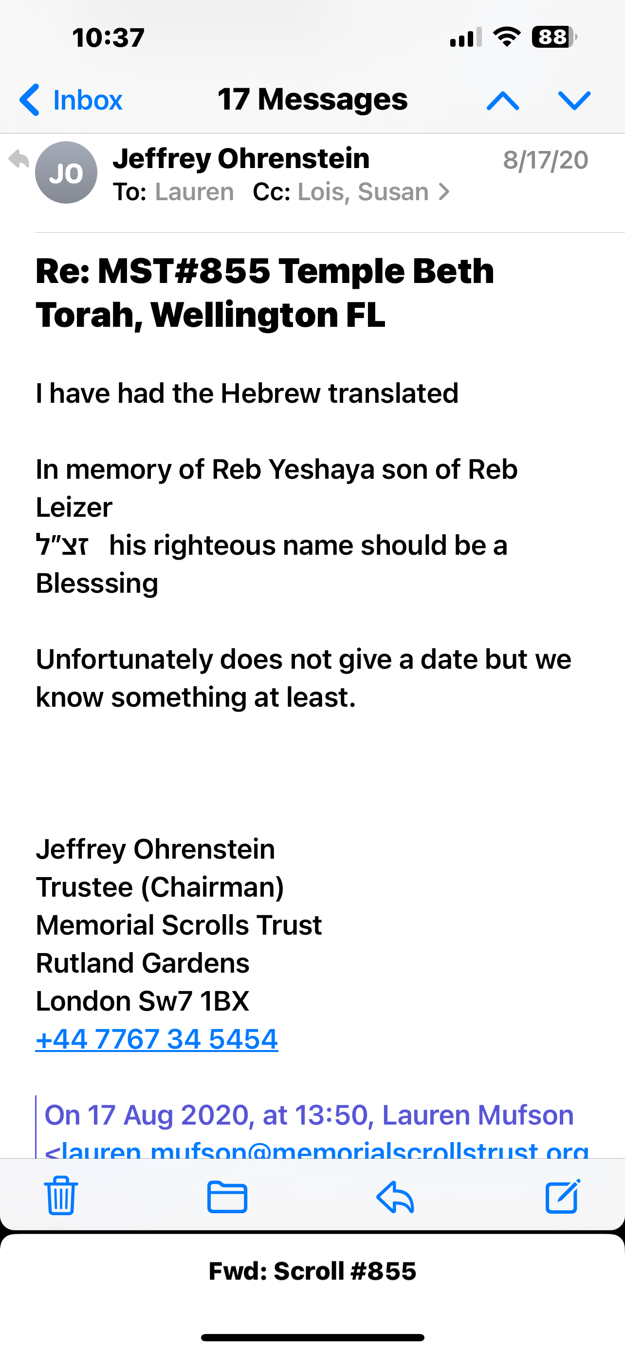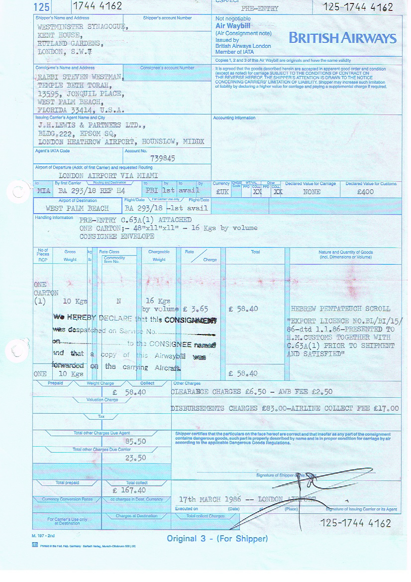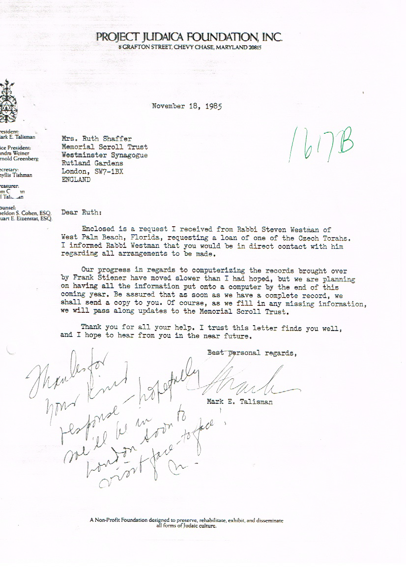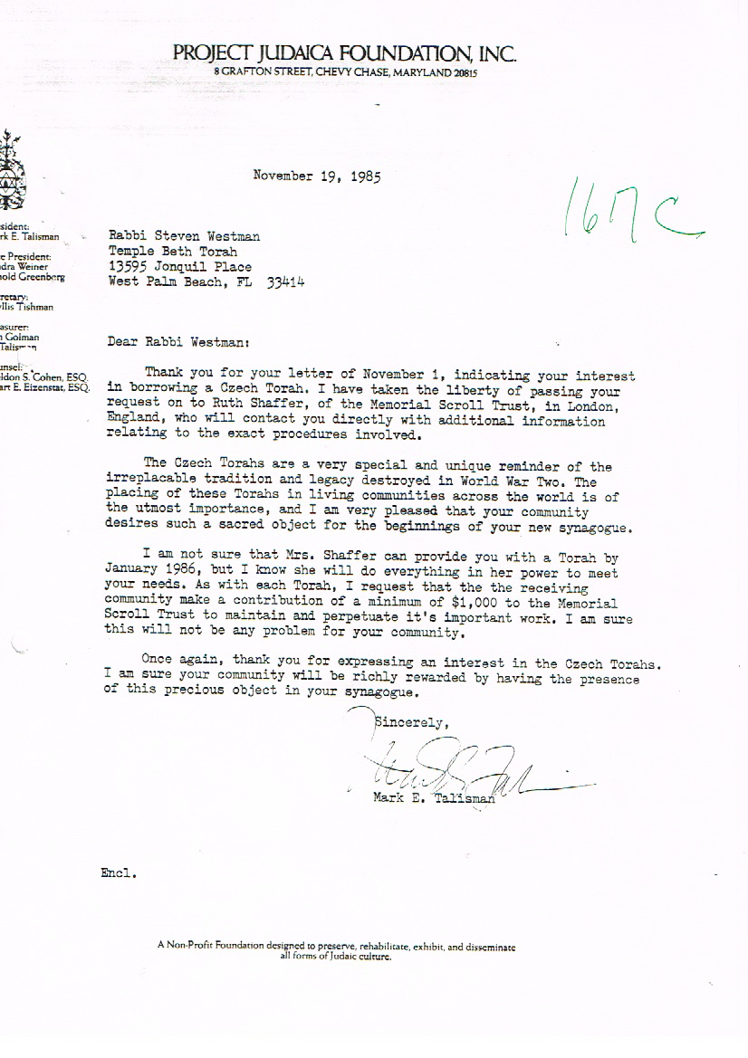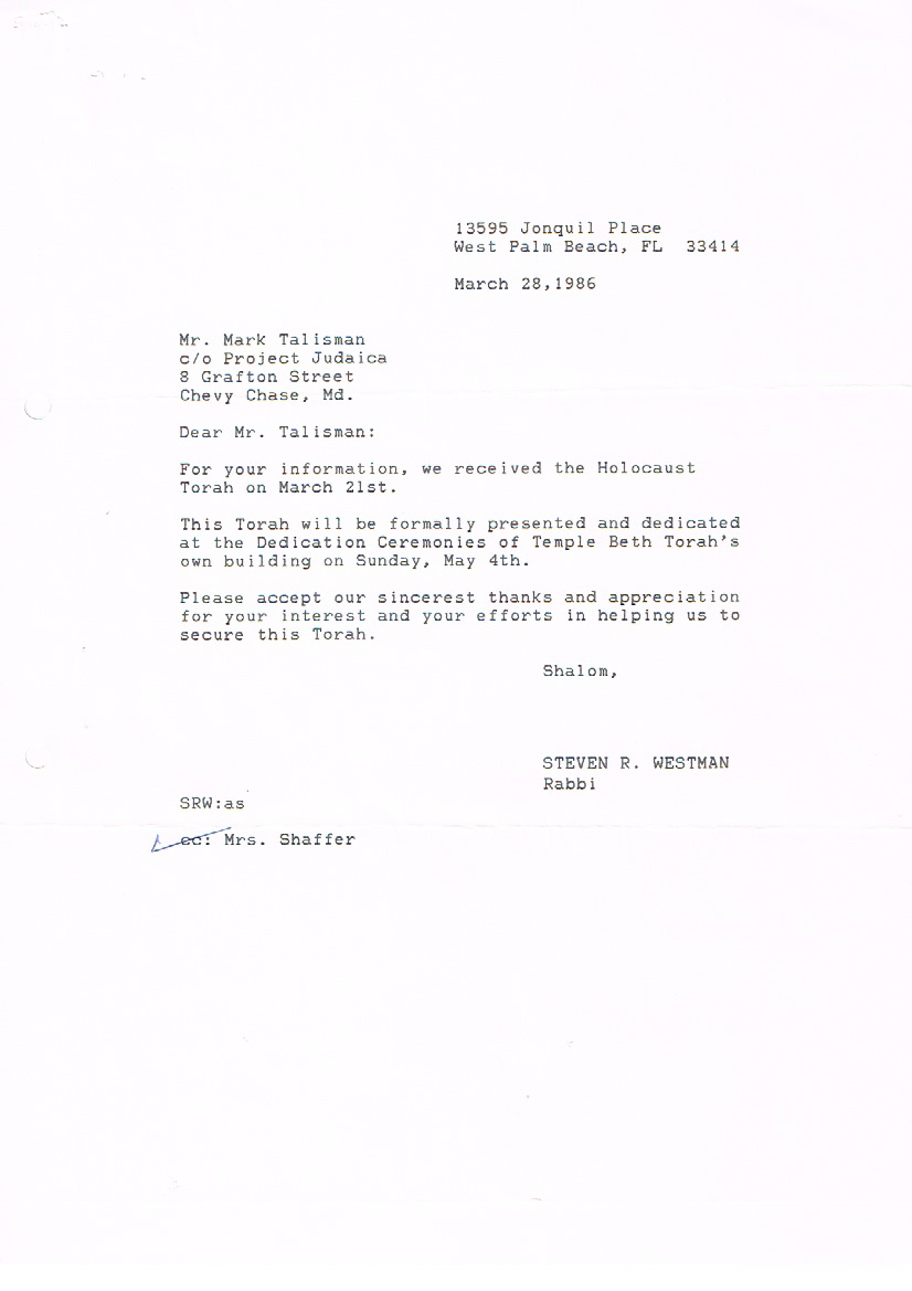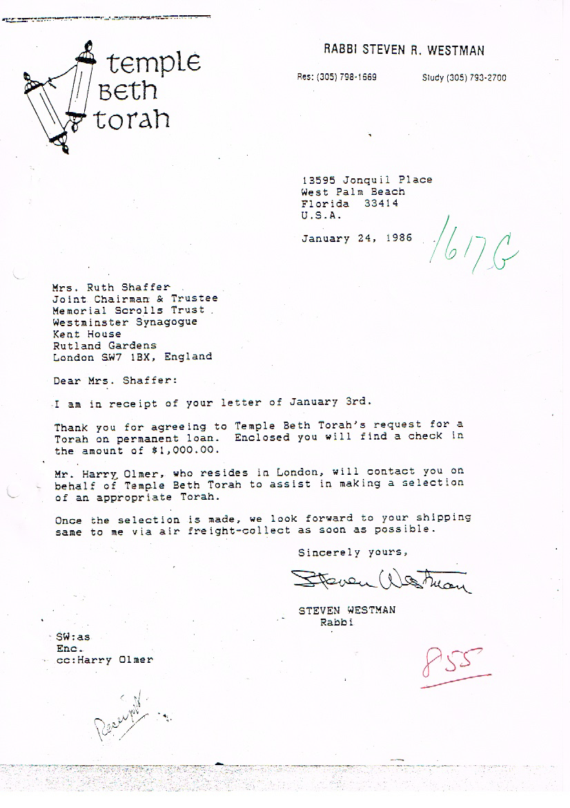 On November 1, 1985, Rabbi Steven Westman began the formal process of requesting one of the Memorial Czech Torah Scrolls that were recovered in 1964 be sent to Temple Beth Torah on permanent loan for our congregation. The following documents are a series of correspondence between Rabbi Westman and the Memorial Scrolls Trust. The scroll arrived on March 21, 1986, just in time for the temple’s building dedication