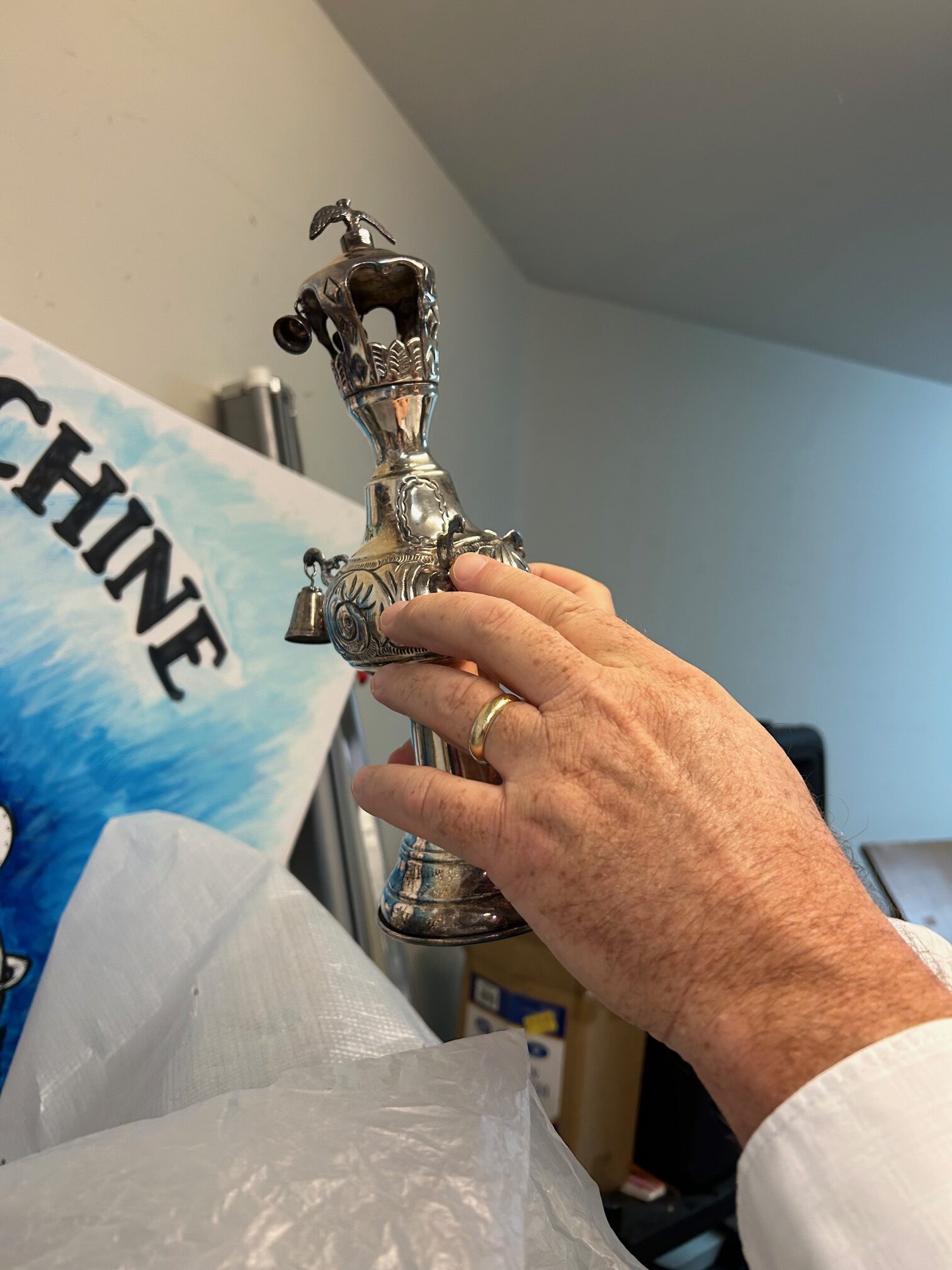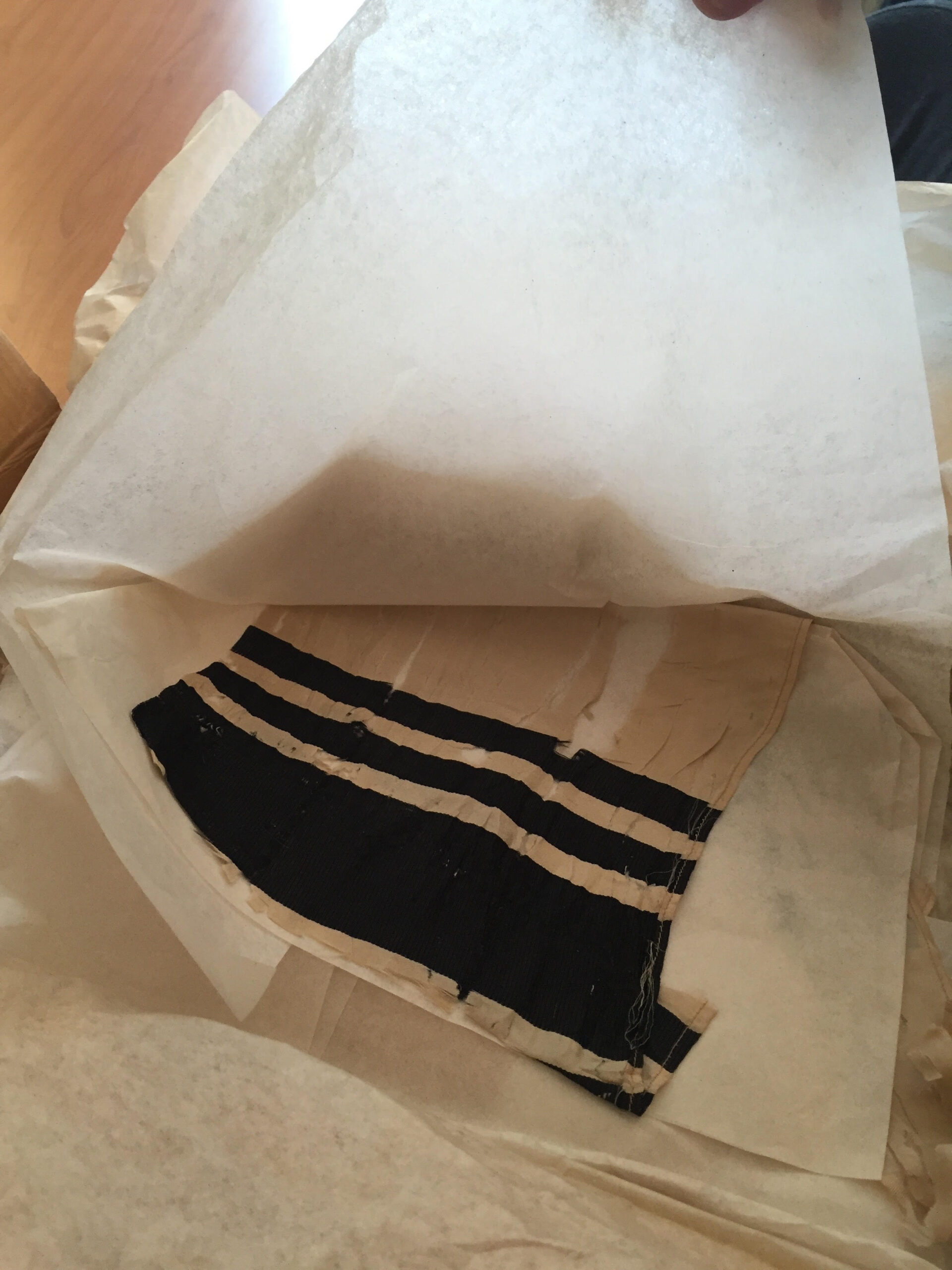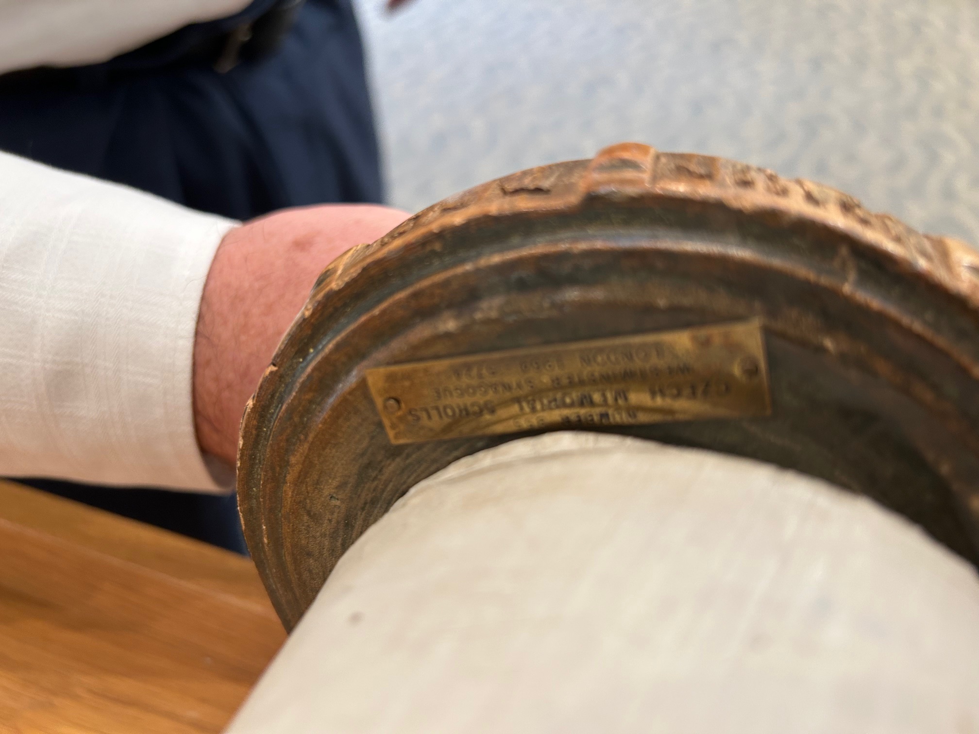 Photo of Czech Torah #855 when it arrived in London in 1964. As you can see, it was wrapped in a tallit. It was originally thought to be an orphan scroll until it’s town of origin was eventually discovered.